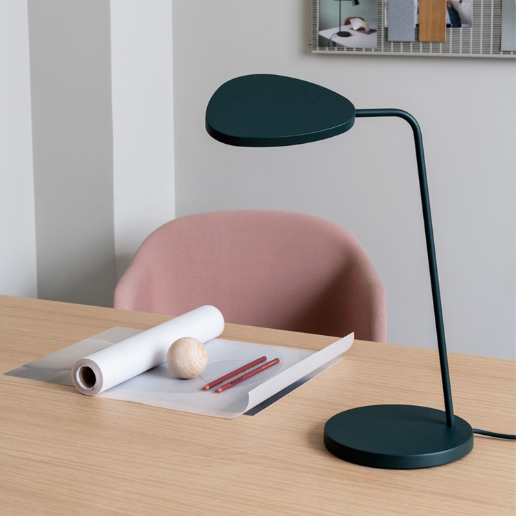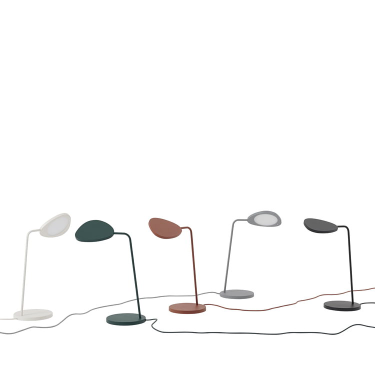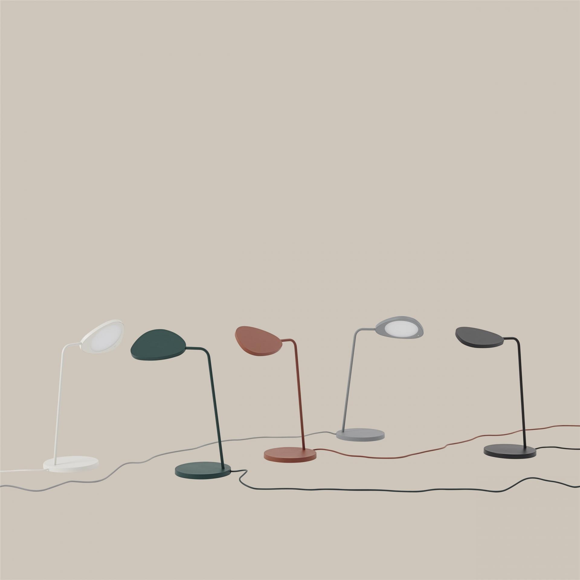 Aluminum, Brass, Coloured PVC cord. The Leaf Table Lamp is a result of a process combining turned and casted aluminum and steel, with a strong powder coating as paint. It has a build-in energy-efficient LED bulb with a Lumen Maintenance (Lifetime) of L90 B10 35.000 hours.