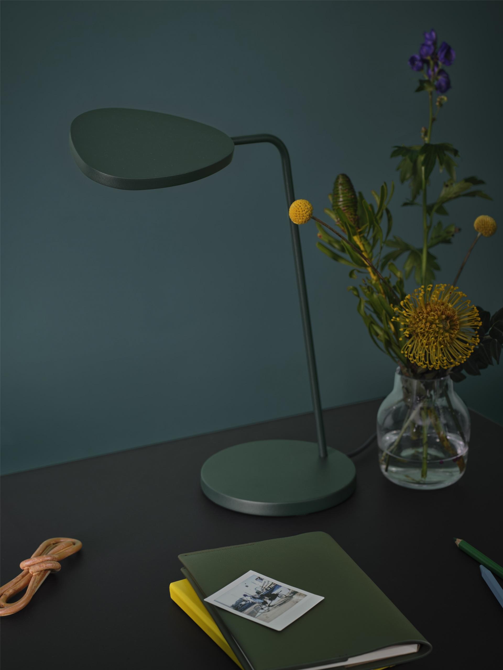 Aluminum, Brass, Coloured PVC cord. The Leaf Table Lamp is a result of a process combining turned and casted aluminum and steel, with a strong powder coating as paint. It has a build-in energy-efficient LED bulb with a Lumen Maintenance (Lifetime) of L90 B10 35.000 hours.