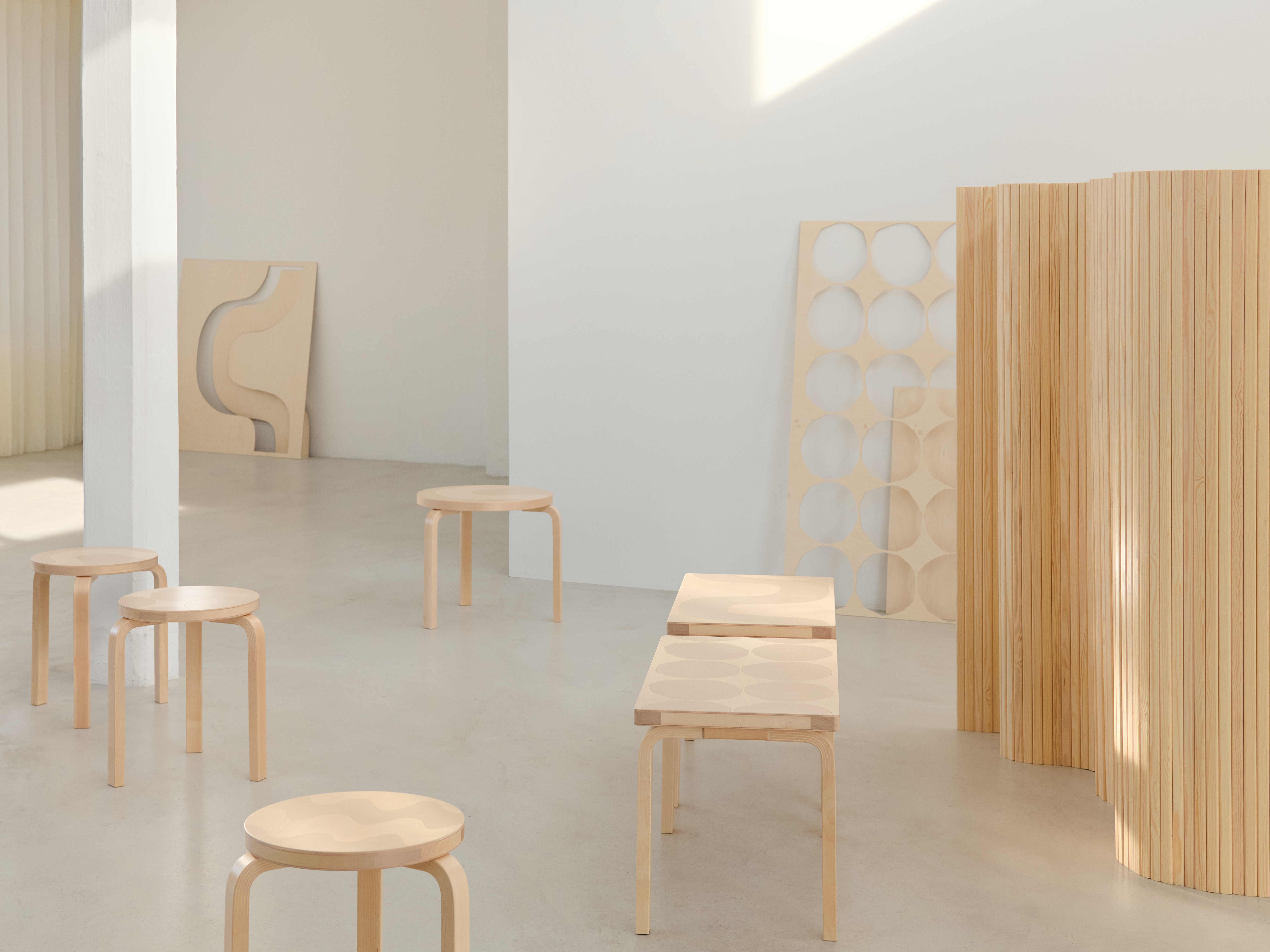 artek의 목재 굽힘 기술과 marimekko의 대담한 프린트가 만나
